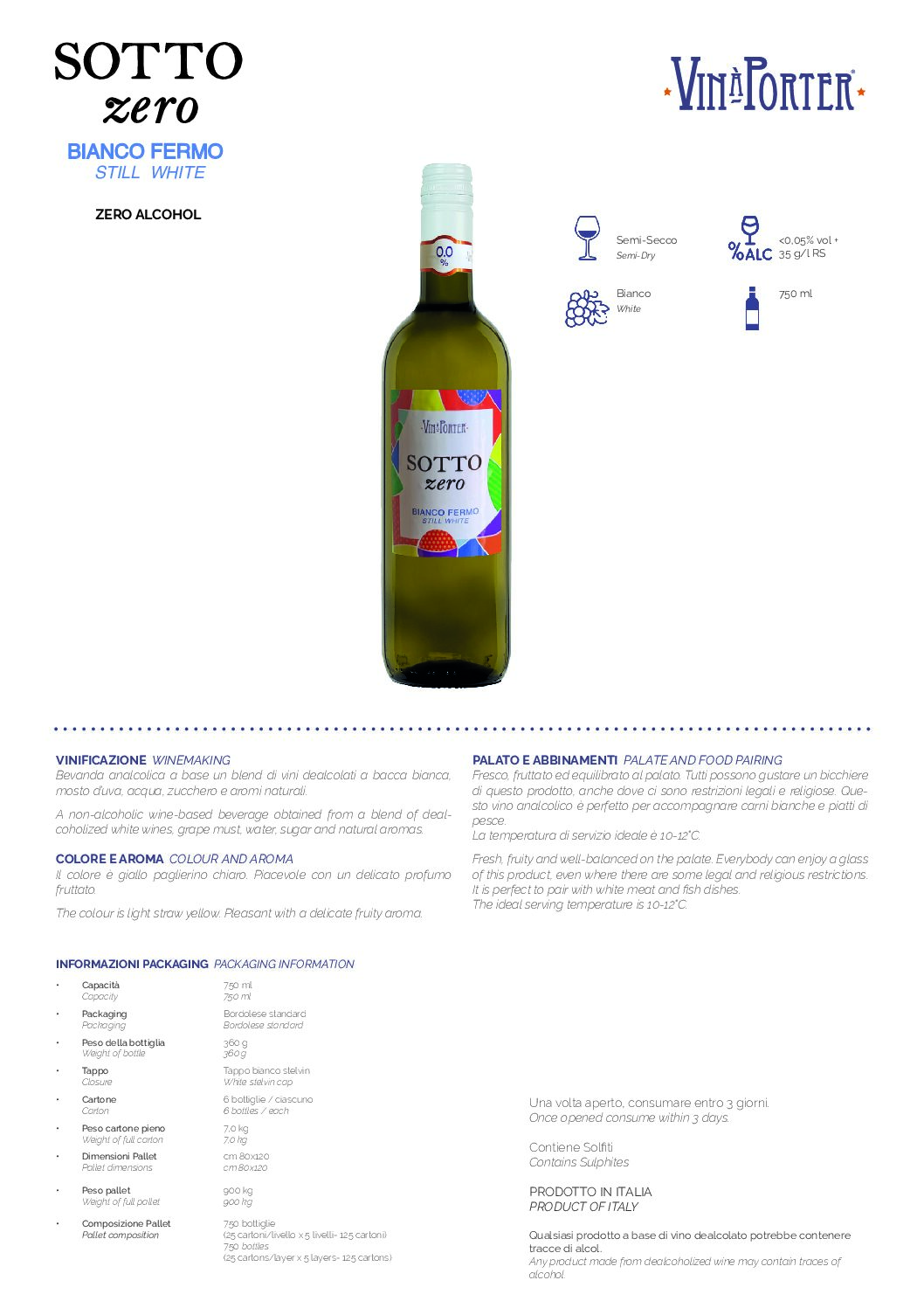 Questa bevanda analcolica è realizzata combinando vini bianchi dealcolati, mosto d’uva, acqua, zucchero e aromi naturali. Adatta a tutti, può essere consumata ovunque, anche in contesti con fiscali o legate alla guida. Presenta un colore giallo pallido e offre un gusto fresco, fruttato e ben equilibrato.